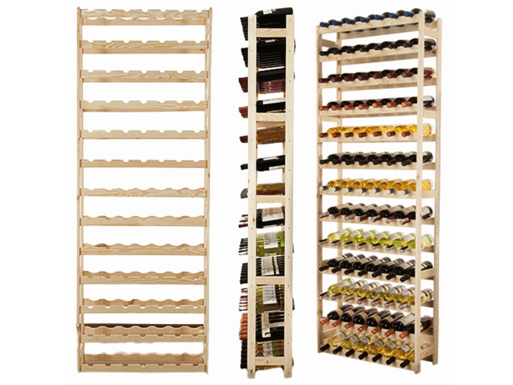 Pre skutočných milovníkov a zberateľov vína prinášame riešenie, ktoré splní aj tie najnáročnejšie požiadavky. Tento vysokokapacitný regál z masívnej borovice bezpečne uloží až 91 fliaš a stane sa dominantou a pýchou vašej vínnej pivnice, komory alebo priestrannej obývačky. Doprajte svojej rozsiahlej zbierke domov, aký si zaslúži.