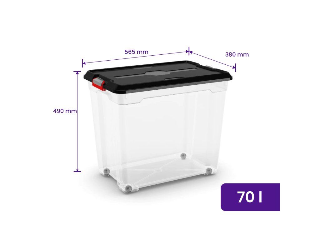 Plastový box MOBIL XXL, 70 l je najväčším úložným boxom z radu MOBIL, ktorý kombinuje objem, prehľadnosť a praktickosť. Vďaka rozmerom 56,5 × 38 × 49 cm ponúka naozaj veľký priestor na uloženie objemnejších vecí, zatiaľ čo integrované kolieska umožňujú ľahkú manipuláciu aj pri plnom zaťažení. Transparentné telo zaistí dokonalý prehľad o obsahu, a pevné čierne veko s klipmi ho ochráni pred prachom, vlhkosťou a nečistotami. Ideálna voľba pre každú domácnosť, dielňu, garáž alebo sklad.
