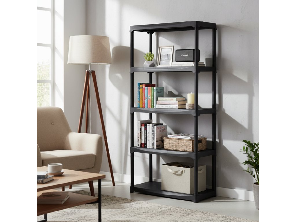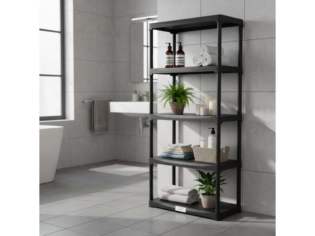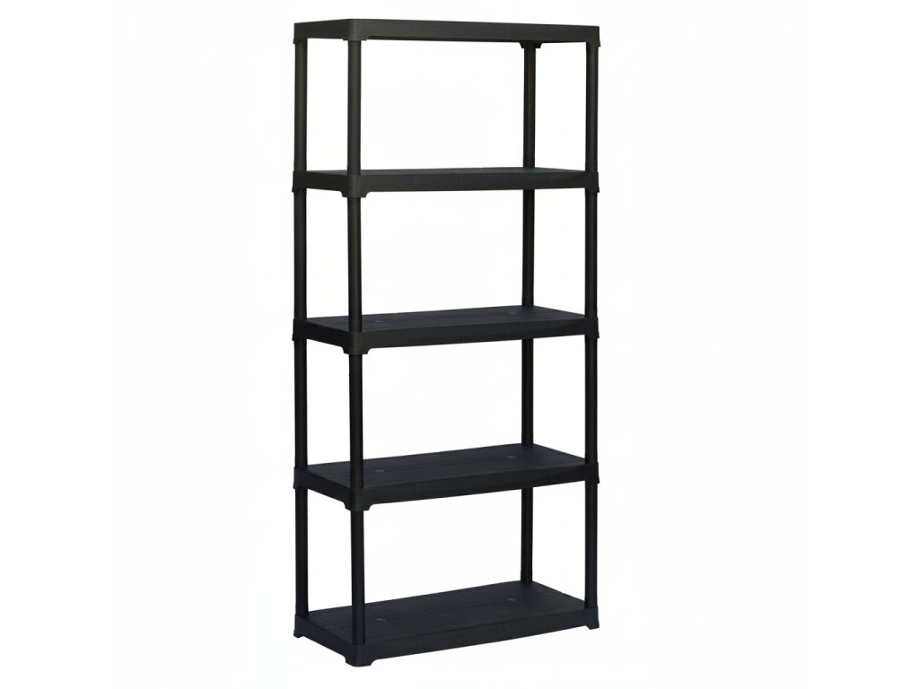 Čierny plastový regál s piatimi policami