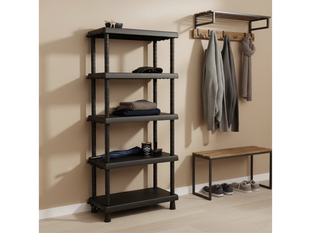 Čierny plastový regál s nastaviteľnými policami a háčikmi